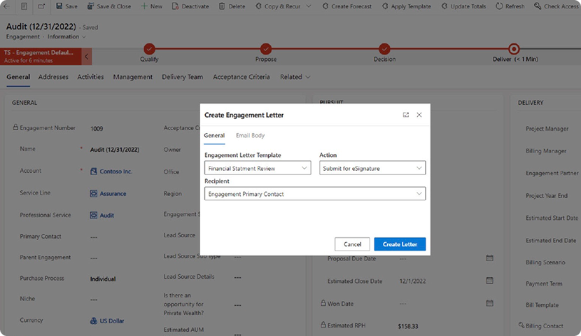 - Automate the creation, routing, and signing of engagement letters.
